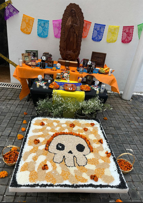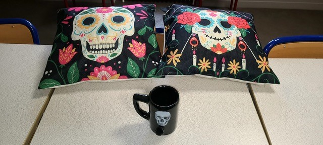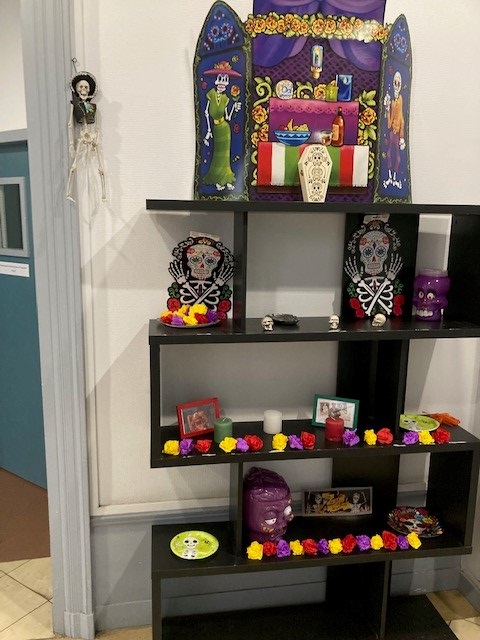 Eh bien, en lien avec nos cours et nos ouvertures culturelles, nous avons traité l’origine de “EL DIA DE MUERTOS” au Mexique. Les mexicains pensent que les mondes des vivants et des morts sont étroitement liés et que les âmes de nos défunts sont encore parmi nous. C’est pourquoi le jour de « día de los muertos », le 2 Novembre (mais cela peut commencer le 1er), ils se recueillent autour de leurs ALTARES